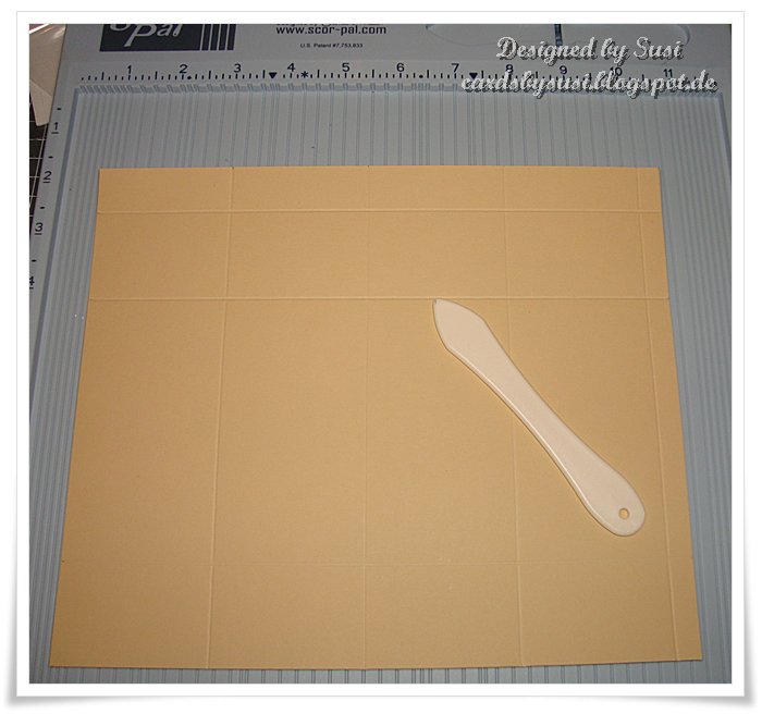 Zunächst sucht ihr euch einen Fotokarton in eurer Wunschfarbe aus und schneidet ihn nach folgenden Maßen (die Zeichnung ist nicht Maßstabgetreu!) zurecht und rillt ihn an allen eingezeichneten Kanten.
